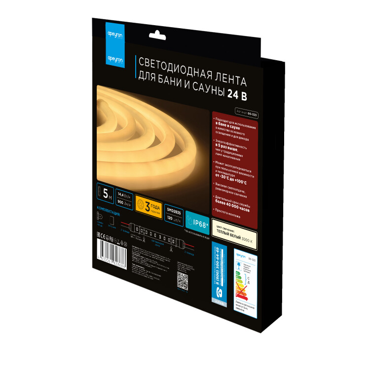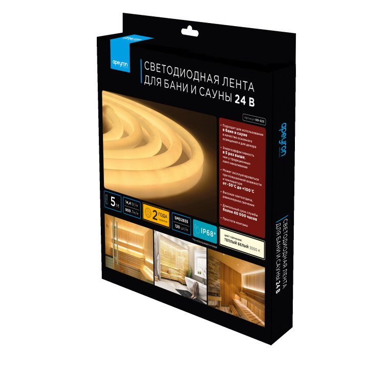 Лента свд 24В 14,4Вт/м 120свд/м 3000К 900лм/м 2835 IP68 Apeyron для САУНЫ кратно 5м