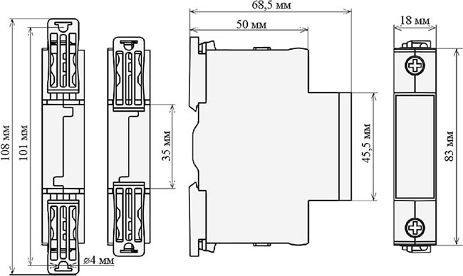 Крепление осуществляется на монтажную DIN-рейку шириной 35 мм (ГОСТ Р МЭК 60715 - 2003) или на ровную поверхность винтами или шурупами через отверстие в фиксаторе.