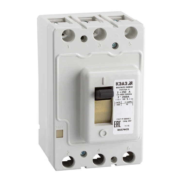 Автоматические выключатели КЭАЗ типа ВА57Ф35 в литом корпусе предназначены для эксплуатации в низковольтных распределительных устройствах переменного тока напряжением до 400 В частотой 50 и 60 Гц.
