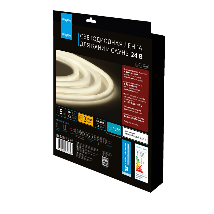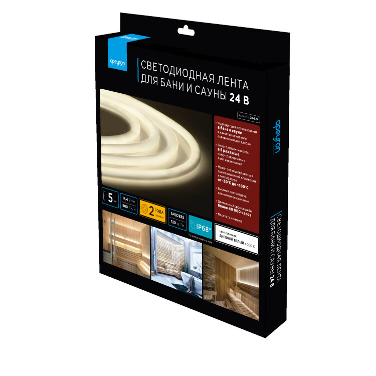 Светодиодная лента для бани и сауны с артикулом 00-324 работает от постоянного тока с напряжением 24В. Благодаря светодиодам smd 2835 излучающим световой поток равный 900 Лм/м лента используется для вспомогательной декоративной подсветки областей интерьерного пространства. Светодиодная лента эквивалентна лампам накаливания мощностью 90 Вт. Данная модель светодиодной ленты НЕ ВЫБРАН ЦВЕТ СВЕЧЕНИЯ Потребляемая мощность светодиодной ленты равна 14,4 Вт на один метр. Степень защиты этого изделия соответствует стандарту IP68. Герметичная силиконовая оболочка позволяет использовать светодиодную ленту в банях и саунах. Не использовать в воде! Отрезать светодиодную ленту можно через каждые 50 мм. В комплект поставки входит: светодиодная лента 5 м, крепеж 10 шт., заглушки 2 шт. в сборе +1 шт.