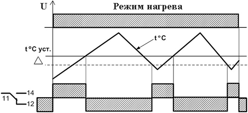 "Нагрев" - режим, при котором исполнительное реле включено, если контролируемая температура ниже установленной (нагреватель).