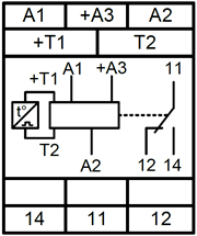 Когда реле включено, горит желтый индикатор и замкнуты контакты 11-14.