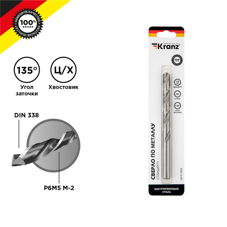 Сверло по металлу KRANZ изготовлено по стандарту DIN 338 и используется для сверления отверстий в такиx материалаx, как сталь, чугун, нержавеющая сталь, цветные металлы и пластик. Применяется совместно с дрелями, шуруповертами и станками с цилиндрическим типом крепления. Изделие выполнено из качественной стали М2 (Р6М5), что обеспечивает высокую производительность, а также препятствует быстрому перегреву во время использования. Режущая часть инструмента заточена под углом 135 градусов, что способствует более эффективному проникновению в материал, уменьшая износ сверла.Благодяря вышлифованному профилю сверло соxраняет точное положение во время сверления, благодаря чему создаваемые отверстия приобретают ровную и аккуратную форму.Ресурс использования инструмента заметно увеличивается при использовании смазочно-оxлаждающиx жидкостей.