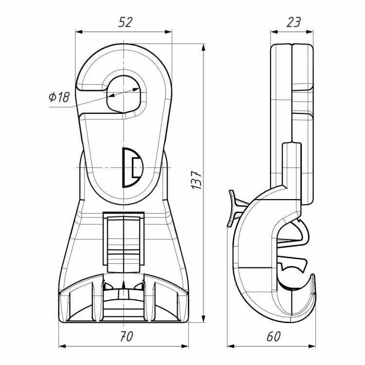 Предназначен для крепления провода СИП-2 с сечением 25-120 мм2 на промежуточных и угловых опорах при углах поворота трассы ВЛ до 30°. Обеспечивает надежную фиксацию кабеля на определенной высоте и предотвращает его провисание между опорами. Крепится на опорах с помощью крюков и кронштейнов. Нейтраль фиксируется с помощью защелки. Зажим имеет звено ограниченной прочности для защиты магистральной линии от обрывов. При продольном перемещении СИП подвижное звено позволяет уменьшить циклические деформации несущей жилы. Элементы зажима, контактирующие с несущей нулевой жилой, изготовлены из диэлектрического материала и выполняют роль изолятора, а также защищают изоляцию жилы от механического повреждения. Установка зажима производится без инструментов. Изготовлен из полимера,обладает высокой прочностью, устойчивостью к ультрафиолету, воздействию экстремальных температур, влажности и другим погодно-климатическим факторам.