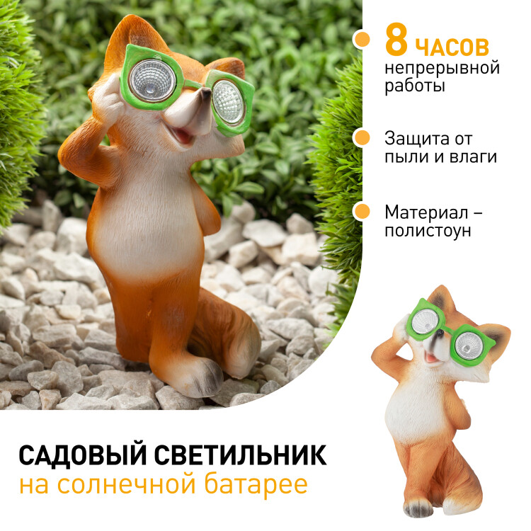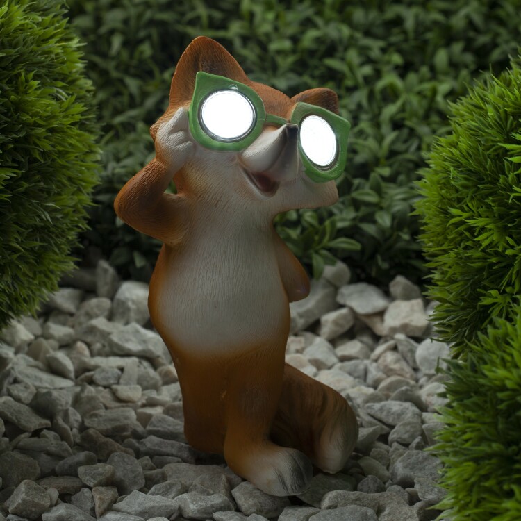 Светильник функционирует на солнечной батарее. Данный способ получения энергии является самым экологичным, энергоемким, а также бесшумным. Питание происходит во включенном режиме, днем. С наступлением темноты кокетливая лисичка загорается. Участок вокруг нее освещается белым светом, исходящим из глаз. Создается настоящая атмосфера сказки. Необычный дизайн фигурки будет радовать и забавлять гостей и хозяев участка.