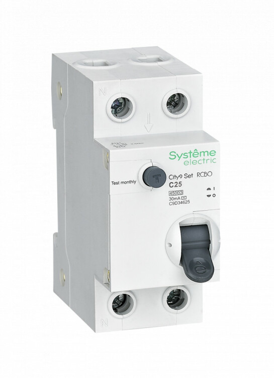Автоматические выключатели дифференциального тока (АВДТ) серии City9 Set Systeme Electric,1P+N, номинальный ток 25 А, характеристика С, Icn = 4.5 кА, ток утечки 30 мА, тип АС. АВДТ применяется в электрических сетях напряжением 230В. Предназначен для защиты сети от перегрузок, людей от поражения электрическим током и токов короткого замыкания. Уставка по току утечки 30 мА обеспечивает гарантированную защиту людей при прямом прикосновении. Кнопка тест обеспечивает проверку работоспособности аппарата. Крепление на DIN-рейку шириной 35 мм. Безопасные клеммы (ранее Schneider Electric EZ9D34625).