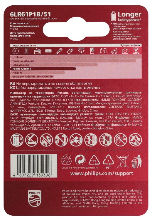 • Щелочные батареи Philips содержат 0 % кадмия, ртути и свинца