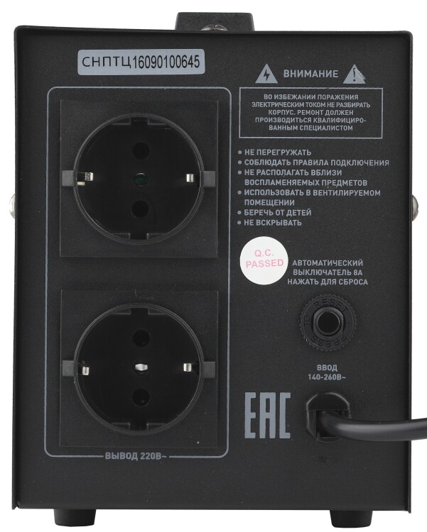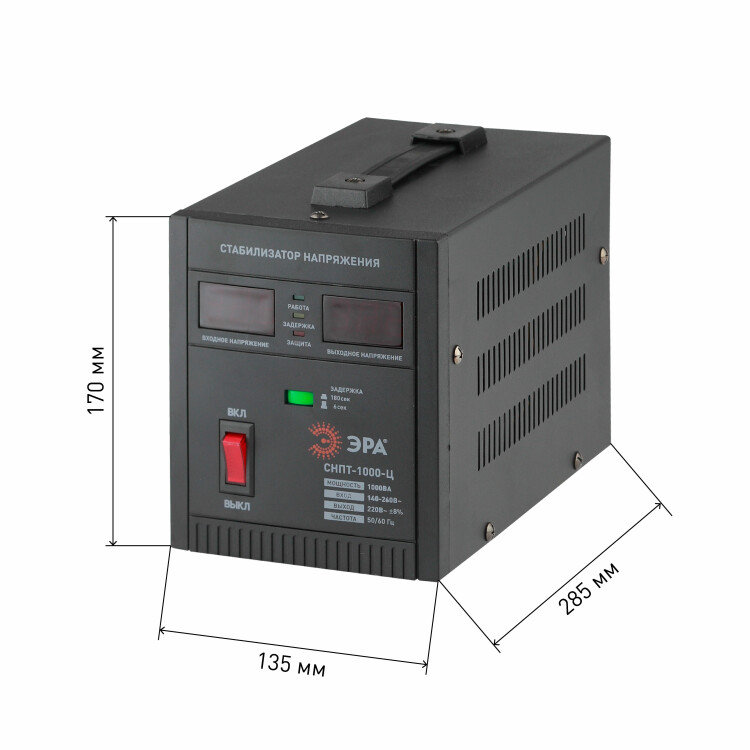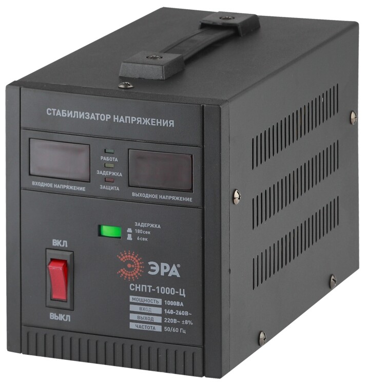 Стабилизатор напряжения переносной /напольный однофазный релейный цвет чёрный модели СНПТ-1000-Ц. Номинальные характеристики (полная мощность / диапазон входного напряжения): 1000ВА 140-260В . Предназначен для поддержания стабильного однофазного напряжения питания бытовых приборов при отклонениях значений сетевого напряжения. Выбирая стабилизатор, нужно знать, какое электрооборудование будет к нему подключено: один прибор, группу приборов либо вся домашняя (офисная) техника. Затем необходимо рассчитать суммарную мощность защищаемых электропотребителей. Основное условие выбора мощности стабилизатора напряжения - суммарная мощность подключаемой к нему нагрузки не должна превышать полной мощности самого стабилизатора (в противном случае автоматика стабилизатора будет их просто отключать). Точные значения мощности можно узнать из паспортных данных Вашего конкретного потребителя. Стабилизатор подбирается с запасом в 25-30% к его полной мощности.