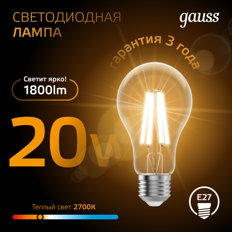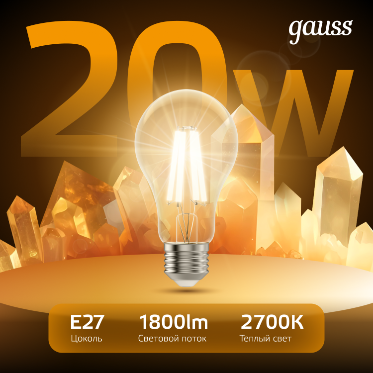 Лампа свд 220В E27 20Вт 2700К 1800лм стандарт A60 прозрачная филамент Gauss