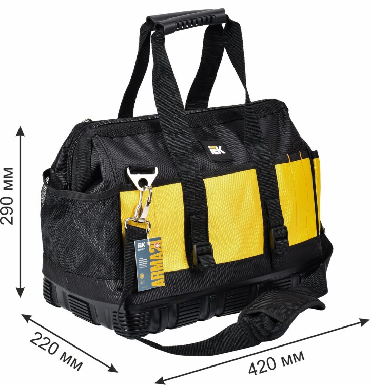 Сумка монтажника с резиновым дном BG-01 предназначена для удобной и безопасной транспортировки инструментов при выездных работах. Сумка выполнена из ткани полиэстер 1680D Оксфорд с PVC-пропиткой. Прорезиненное дно с высокими бортиками защищает сумку от промокания и загрязнения. Резиновые ручки и наплечник с анатомической вставкой.