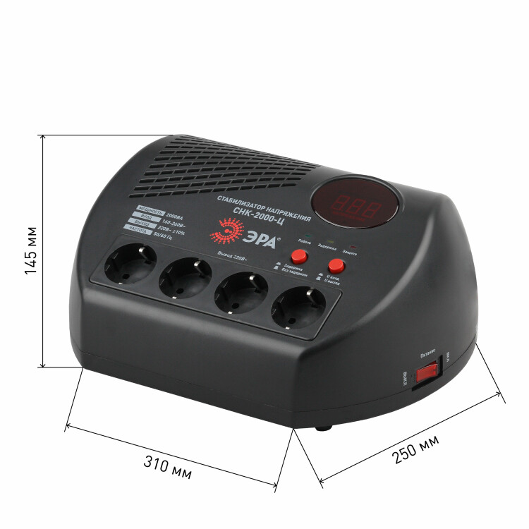 Стабилизатор напряжения компактный однофазный релейный цвет чёрный модели СНК-2000-Ц. Номинальные характеристики (полная мощность / диапазон входного напряжения): 2000ВА 160-260В . Предназначен для поддержания стабильного однофазного напряжения питания бытовых приборов при отклонениях значений сетевого напряжения. Выбирая стабилизатор, нужно знать, какое электрооборудование будет к нему подключено: один прибор, группу приборов (наиболее чувствительных к перепадам напряжения в сети) либо вся домашняя (офисная) техника. Затем необходимо рассчитать суммарную мощность защищаемых электропотребителей. Основное условие выбора мощности стабилизатора напряжения - суммарная мощность подключаемой к нему нагрузки не должна превышать полной мощности самого стабилизатора (в противном случае автоматика стабилизатора будет их просто отключать). Точные значения мощности можно узнать из паспортных данных Вашего конкретного потребителя. Стабилизатор подбирается с запасом в 25-30% к его полной мощности.
