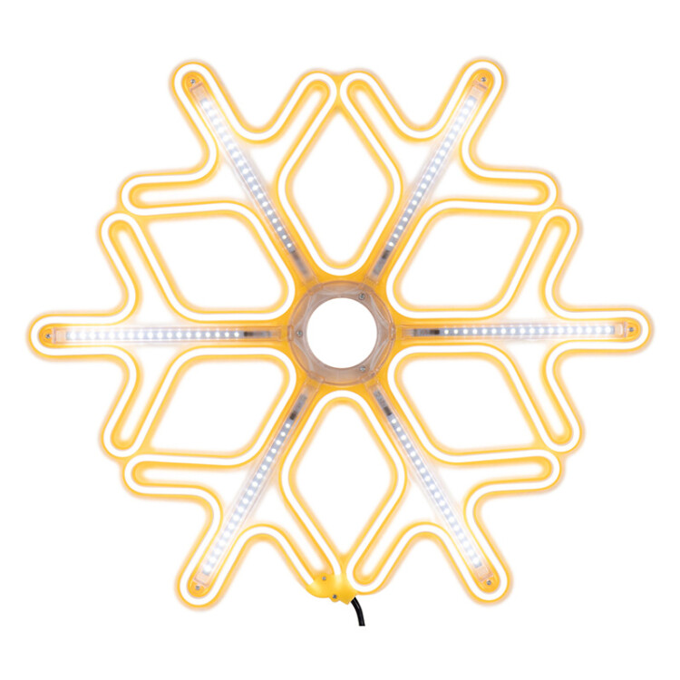 "Снежинка" имеет размер 60x60 см, выполнена из теплого белого неона и белыx светодиодныx лучей.