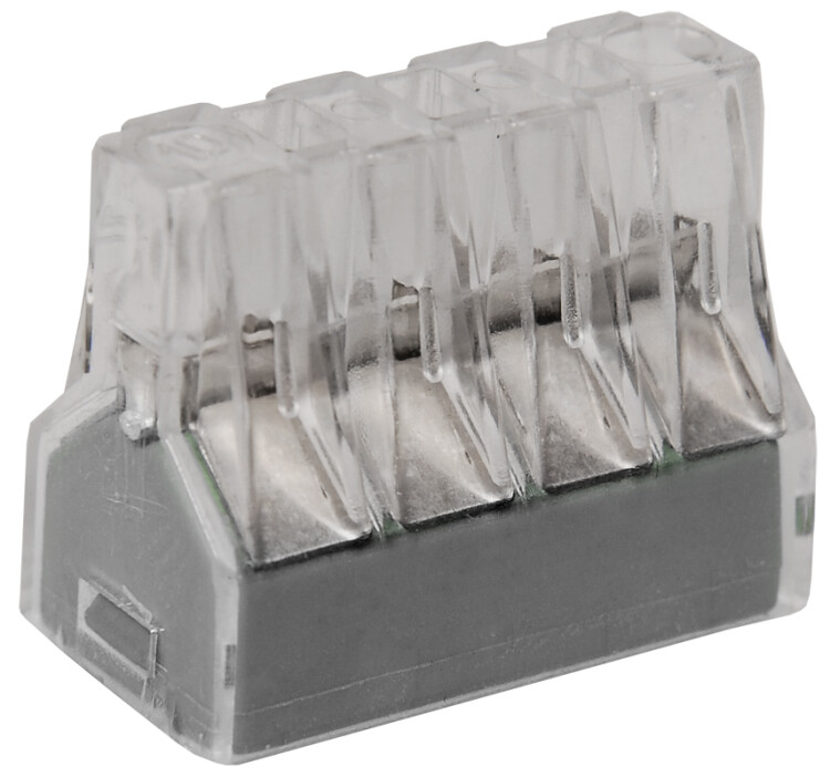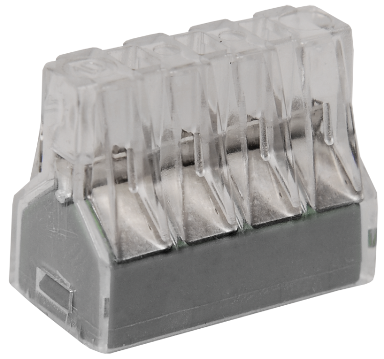Строительно-монтажная клемма серии 773 в прозрачном корпусе, без контактной пасты, предназначена для однократного подключения одножильных/ многожильных медных проводников.