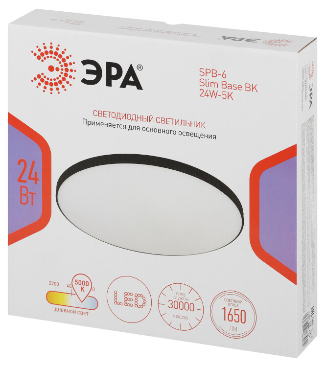Светодиодный светильник ЭРА SPB-6 Slim Base BK 24W-5K – современное решение для общего освещения жилых и коммерческих помещений.