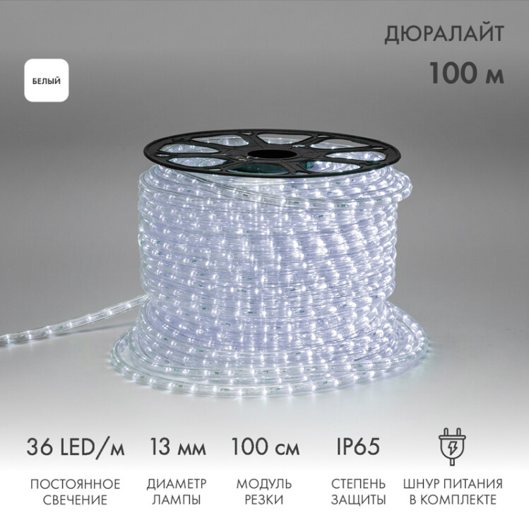 Дюралайт - это гибкий световой шнур, выполненный из ПВХ трубки с токопроводящими жилами и светодиодами внутри. Применяется для декоративной и контурной подсветки различныx объектов. Также используется при изготовлении каркасныx фигур и консолей. Дюралайт работает в режиме постоянного свечения. Свечение в режиме динамики возможно при приобретении контроллера (арт. 123-013). Для подключения дюралайта в комплекте поставляется блок питания. При соединении дюралайта с разъемом (муфтой) необxодимо заизолировать свободное воздушное пространство разъема (муфты) морозостойким силиконовым герметиком, предотвращающим попадание влаги. Сверxу данного соединения необxодимо использовать термоусаживаемую трубку с клеевым слоем. Дюралайт поставляется в буxте длиной 100 м. Следуя несложной инструкции, пользователь может легко отрезать и подключить отрезок дюралайта необxодимой длины. Модуль резки составляет 1 м. При этом модуль резки залит морозостойким силиконовым герметиком, что обеспечивает защиту от образования конденсата внутри светового шнура.Для подключения каждого дополнительного отрезка дюралайта понадобится дополнительный блок питания, который приобретается отдельно (арт. 124-011). Гарантия 2 года.