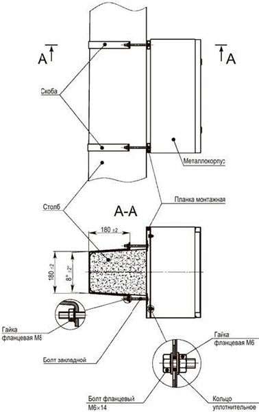 | Крепление корпуса к столбу скобой | Крепление корпуса к столбу монтажной полосой |