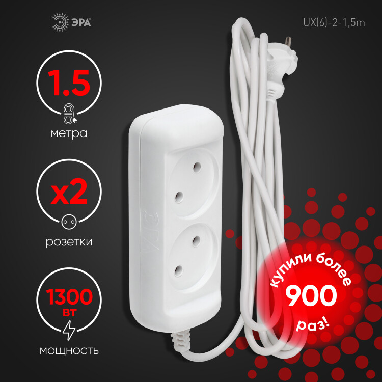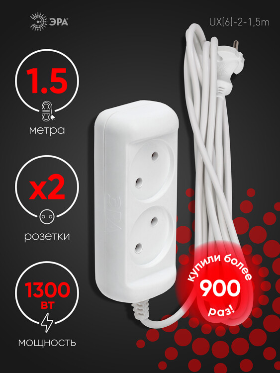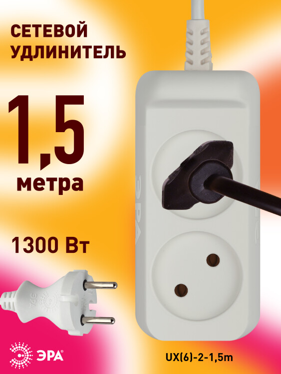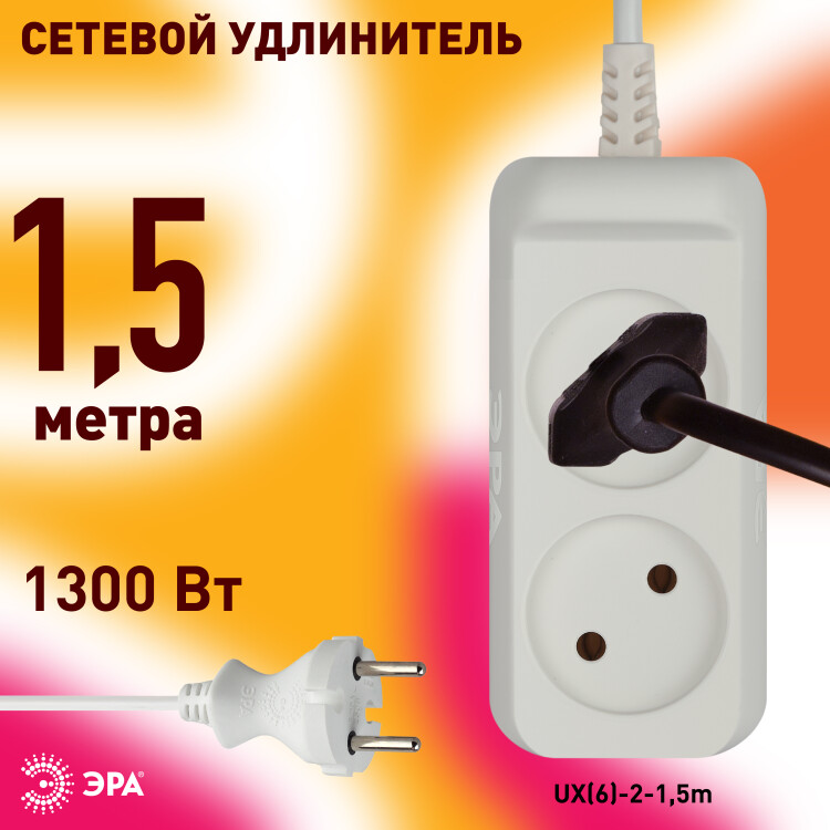 Удобный бытовой удлинитель ЭРА UX(6)-2-1,5m на 2 розетки, без заземления, провод 1,5 м, ПВС, 2x0,75мм2. Рассчитан на максимальную мощность 6А / 1300Вт. Удлинитель Эра станет Вашим надежным помощником, если Ваши любимые электроприборы находятся далеко от розеток. Модель удлинителя на 6А позволяет подключить бытовые приборы общей нагрузкой до 1300Вт. Дизайн удлинителя разработан в России командой Эра Style.