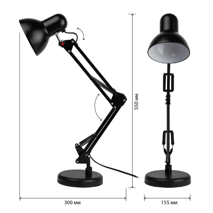 Высота плафона регулируется двухсекционной сгибающейся стойкой, направление света - поворотом и наклоном плафона в любом направлении.