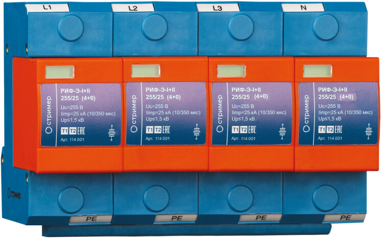 Мощное четыреполюсное УЗИП класса I+II коммутирующего типа со сменными рабочими модулями на основе искровых промежутков. УЗИП выдерживает токовые нагрузки, соответствующие УЗИП класса I, а по способности ограничения импульсных напряжений, допустимых для изоляции оборудования, соответствует УЗИП класса II. Устанавливается в пределах 0А(В) – 1 зон молниезащиты (в соответствии с ГОСТ Р МЭК 62305-1 и СО-153-34.21.122). Предназначено для защиты фазных и нулевого проводников L/PE, N/PE от перенапряжений «провод-земля».