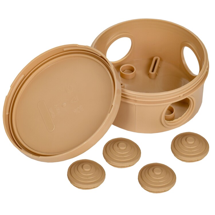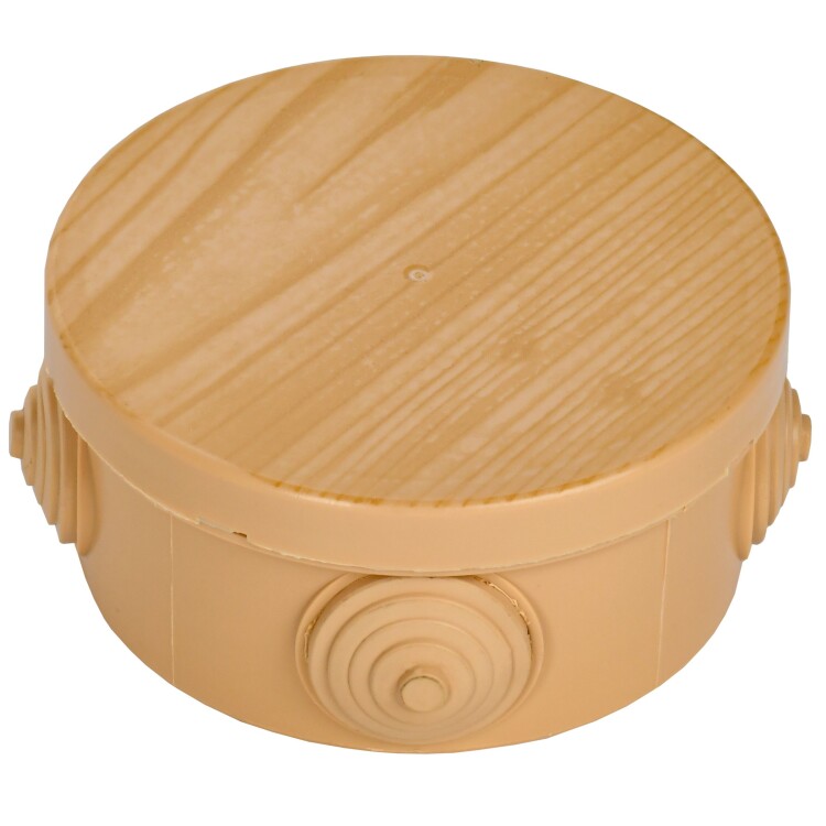 Распределительные коробки с текстурой под дерево незаменимы в загородном деревянном домостроении, подходят для разветвления проводки в помещениях, декорированных деревом.
