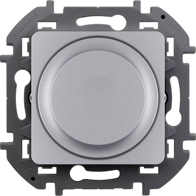 Диммер поворотно-нажимной универсальный для светодиодных и других ламп скрытого монтажа Legrand/Daccord Inspiria, мощность 5-300 Вт лампы накаливания / 5-75 Вт светодиодные лампы, поворотно-нажимной, цвет "Алюминий".