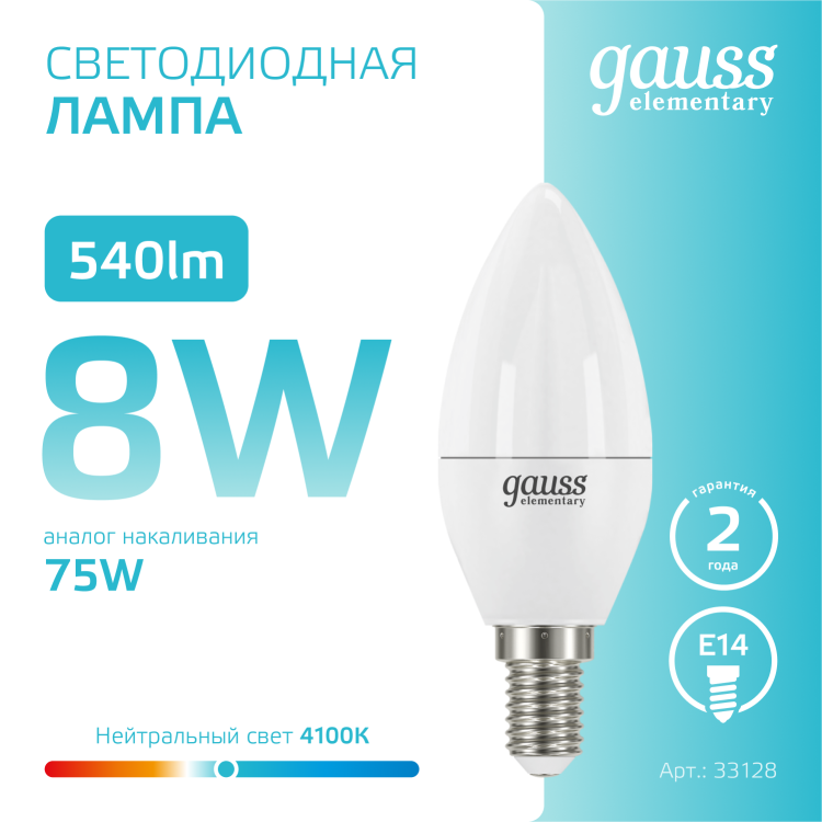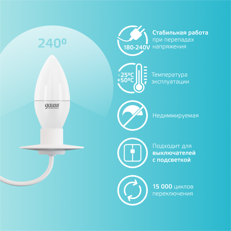 Светодиодные лампы Gauss Elementary Candle созданы в форме свечи. Лампы подойдут как для домашнего, так и для коммерческого использования. Такой тип освещения прекрасно смотрится в светильниках без плафонов или устанавливается в люстры и бра. Модель обладает широким диапазоном цветовых температур и мощностей, что поможет создать атмосферу тепла и уюта или концентрации. Равномерный спектр света создает зрительный комфорт в любом помещении. Данный тип освещения от Gauss обеспечивают стабильную работу в течение всего срока службы.