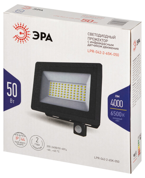 Мощный (50 Вт) светодиодный прожектор серии ЭРА LPR-042-2 с регулируемым инфракрасным датчиком движения. Настраивать можно следующие параметры: временной интервал освещения (от 5 секунд до 8 минут), чувствительность к движению (расстояние 1 — 8 метров), чувствительность ко времени суток (световой поток 5 — 2000 лк). Датчик имеет поворотную конструкцию.