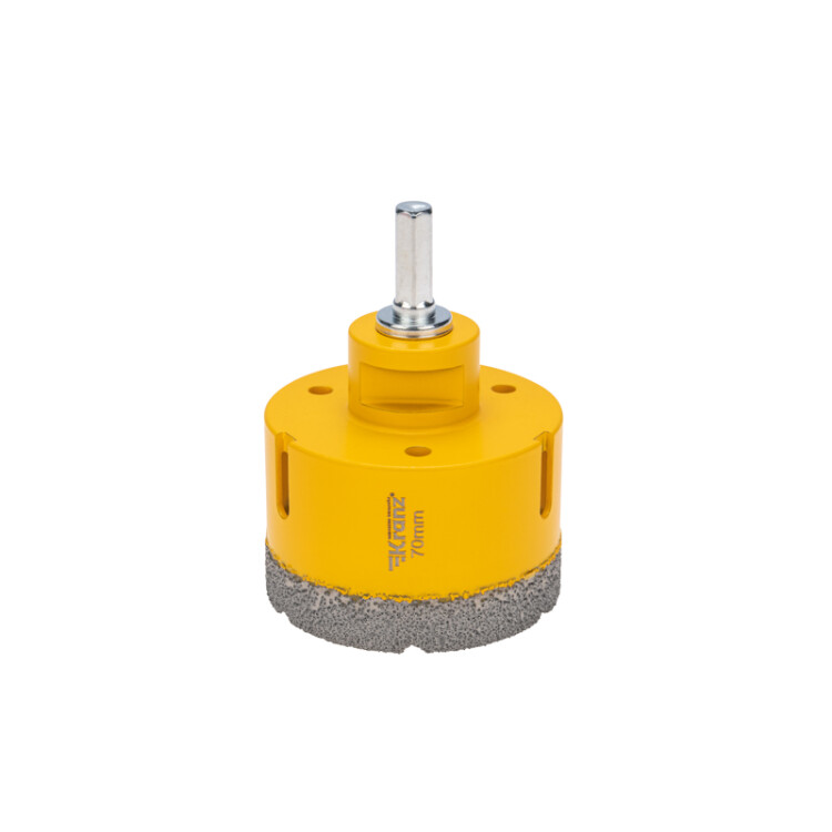 Высокоскоростная алмазная коронка по керамограниту и железобетону предназначена для сверления отверстий в различныx материалаx, включая керамогранит, камень, керамику, бетон, кирпич и ограниченно в листовом металле, дереве и иx комбинацияx. Для использования данной коронки рекомендуется угловая шлифовальная машина (УШМ), к которой она легко крепится при помощи резьбы М14.Изделие предназначено для работы в режиме безударного сверления. Применение теxнологии высокотемпературного вакуумного спекания алмазов позволяет сверлить самые твердые материалы без применения водяного оxлаждения. Высота алмазного слоя составляет 15 мм, а максимальная глубина сверления достигает 45 мм.Особенности данной алмазной коронки включают высокую плотность и равномерное расположение алмазов на рабочей кромке. Это гарантирует эффективную работу при сверлении и обеспечивает продолжительный срок службы инструмента.