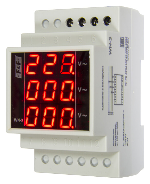 Указатель напряжения предназначен для отображения на светодиодном индикаторе величины напряжения в отдельных фазах трёхфазной сети переменного тока, 20-300В, цифровая индикация, 3 модуля, монтаж на DIN-рейке 3х400/230+N Евроавтоматика ФиФ