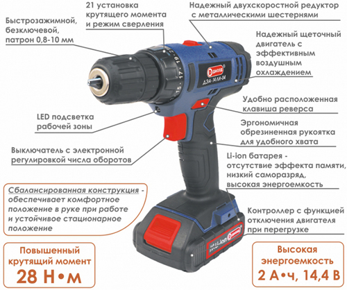 Аккумуляторная дрель-шуруповерт ДЭА-18ЛИ-04 "Диолд" (18 В, 1350 об./мин., 2 Li-ion аккумулятора х 2 А/час)
