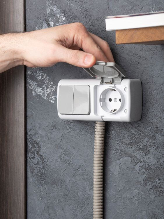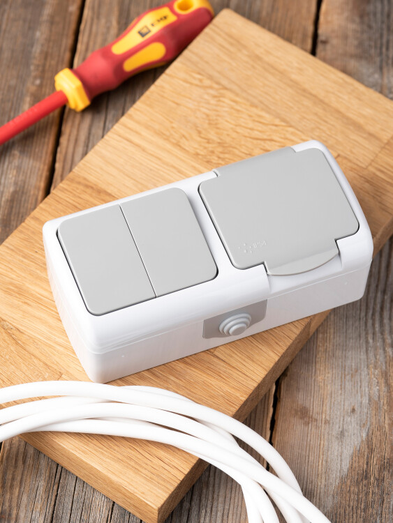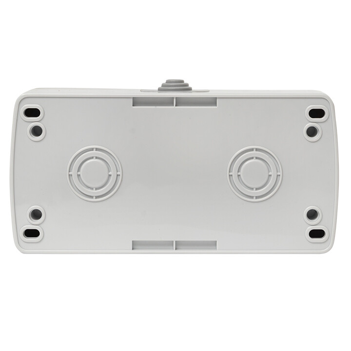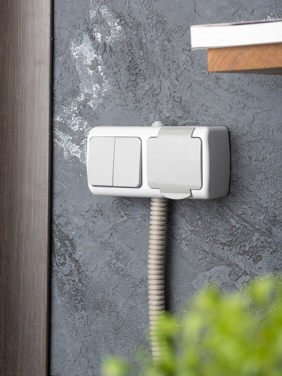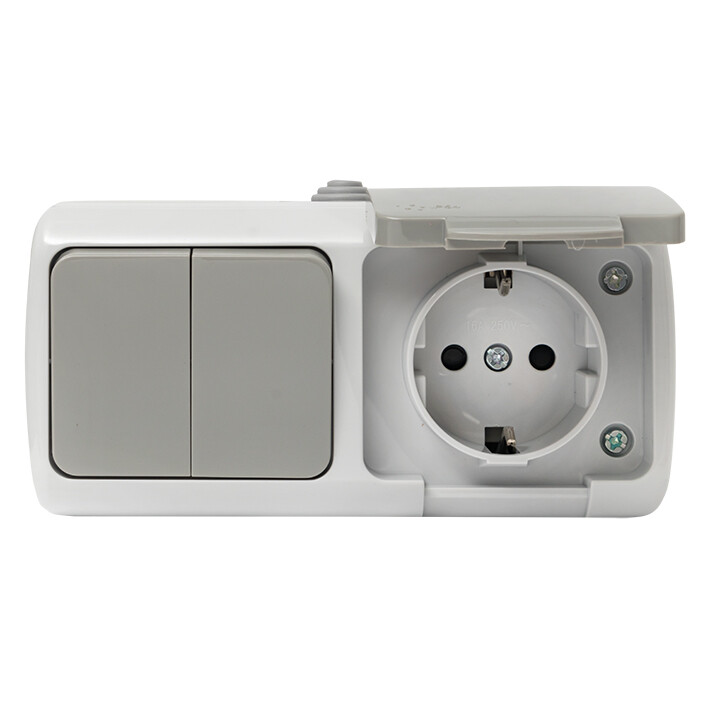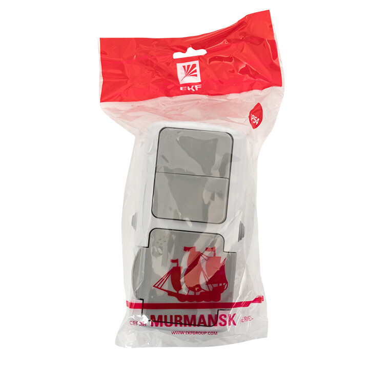 Блок из двухклавишного выключателя и розетки EKF серии Мурманск позволяет организовать электроснабжение в условиях высокой влажности и пыльных помещениях, на улице при условии установки под навесом. Ступенчатые герметичные вводы с двух сторон изделия обеспечивают надежную защиту, позволяя использовать устройство в агрессивных условиях.