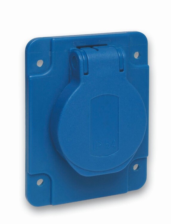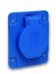 Розетка панельная PratiKa Schneider Electric бытового назначения, на номинальный ток 10-16 А, напряжение 200-250 В, исполнением 2P+PEN, синяя, с фланцем 65 х 85 мм, IP54, с винтовыми присоединениями сзади.