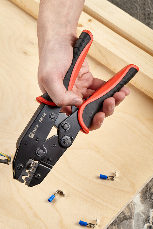 Пресс-клещи pk-04-exp предназначены для НК, РП-М, РП-П наконечников сечением 0,5-6 мм2. Инструмент оснащен храповым механизмом с автоматической разблокировкой по завершению цикла опрессовки. Каждая модель имеет маркировку, указывающую значение сечения используемого наконечника или разъема, а также нанесенную цветовую маркировку, соответствующую цвету изолирующей манжеты. Профиль опрессовки - автоклемма.