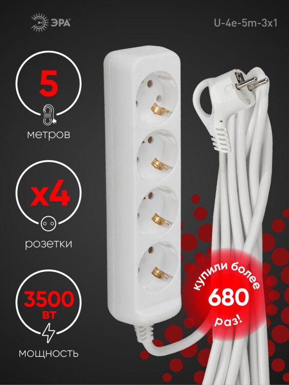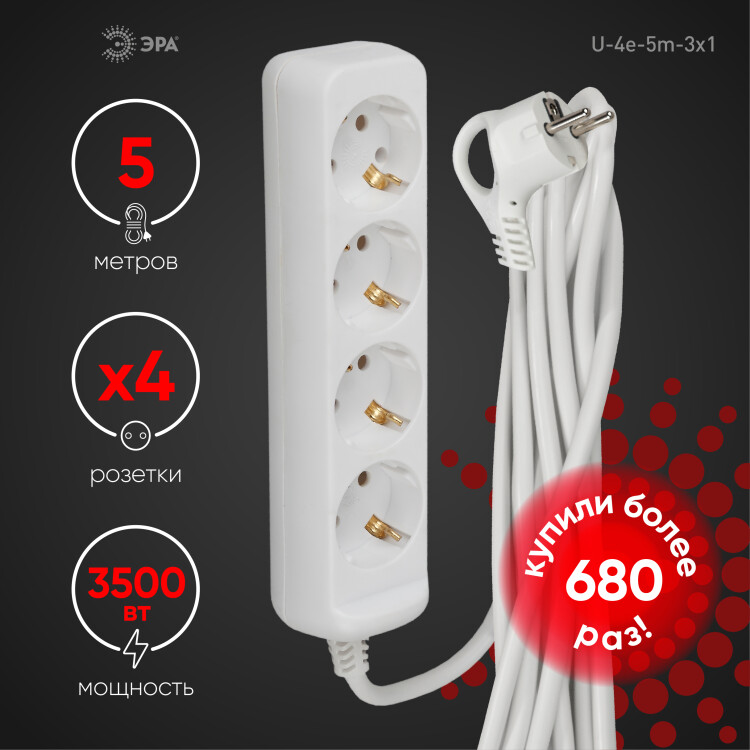 Удлинитель электрический Эра U-4e-5m-3x1 с заземлением, ПВС, 3x1мм2, 4 розетки, 5 м. Рассчитан на максимальную мощность 16А/3500 Вт. Удлинитель Эра станет Вашим надежным помощником, если Ваши любимые электроприборы находятся далеко от розеток. Провод в удлинителях Эра сделан из 100% меди, что делает его абсолютно пожаробезопасным. Корпус выполнен из ударопрочного и негорючего пластика (полипропилен). В моделях с заземлением у вилки есть кольцо для удобного извлечения из розетки. Модель удлинителя на 16А позволяет подключить мощные бытовые приборы общей нагрузкой до 3500Вт. Не бойтесь включить чайник, обогреватель, микроволновку или другие электроприборы. Толстый провод удлинителя Эра гарантирует полную безопасность. Дизайн удлинителя разработан в России командой Эра Style.