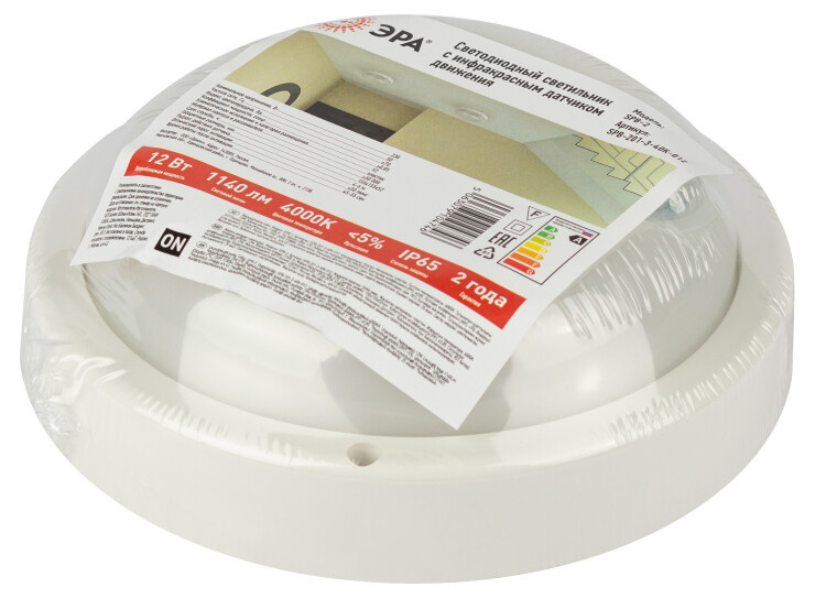 Светильник светодиодный накладной SPB-201-3-40K-012 "Эра" (12 Вт, 1140 лм, 4000 К, IP65), круг Ø155 мм, белый, с инфракрасным датчиком движения
