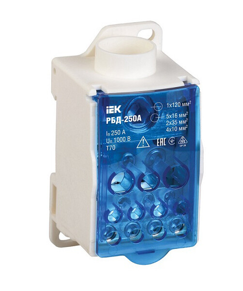 Распределительные блоки РБД предназначены для использования в качестве клеммного зажима при подключении к проводнику большего сечения нескольких проводников меньшего сечения, для создания упорядоченных систем распределения в шкафах, для организации главной заземляющей шины.