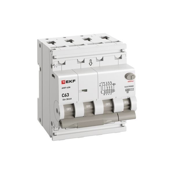 Автоматический выключатель дифференциального тока АВДТ-63N PROXIMA EKF – это аппарат, сочетающий функции автоматического выключателя с электромеханическим или электронным УЗО. При обнаружении автоматическим выключателем в защищаемом участке сети тока утечки (повреждения) на землю или сверхтока (тока перегрузки или короткого замыкания) происходит срабатывание устройства, приводящее к отключению защищаемой сети. Особая конструкция рычага обеспечивает информативность устройства, указывая на причину срабатывания (опущена только часть рычага – короткое замыкание или перегрузка, опущены обе части рычага – ток утечки). Особенностью данной серии АВДТ является усовершенствованная конструкция. Данные выключатели имеют пластиковые крышки, закрывающие доступ к винтовым зажимам и служащие для опломбирования винтовых клемм, что исключает несанкционированный доступ к проводникам. Автоматические выключатели дифференциального тока АВДТ-63N PROXIMA EKF соответствуют ГОСТ IEC 61009-1. Возможна коммутация алюминиевым и медным проводником.