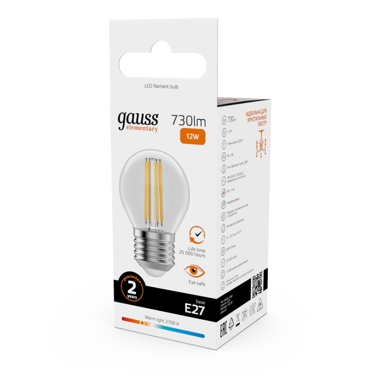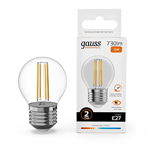 Лампа светодиодная Gauss 52212 Filament Elementary (G45 шар, Е27, 12 Вт, 730 лм, 2700 К, прозрачная колба)