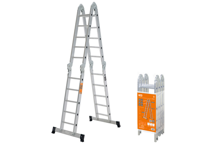 Назначение:br/Для проведения работ, требующих большой площадки для перемещения работника на высоте или использования нескольких типов высотных приспособлений (приставных лестниц, стремянок или помостов).br/Применение:br/Для использования в быту, при проведении ремонтных, монтажных и прочих общестроительных работ, где требуются различные по форме и назначению высотные конструкции; Во время монтажа крупногабаритных электроустановок и длинных направляющих потолочных конструкций для одновременной работы двух человек либо для оперативного перемещения по площадке без переноса самой лестницы.br/Преимущества:br/Прочность и надежность при небольшой массе изделия.Многофункциональность возможность трансформирования в приставную лестницу приставную согнутую лестницу, стремянку или помост.Регулировка шарнирных замков одной рукой.Широкие поперечные траверсы с противоскользящими башмаками на заклёпках.Рифленые ступени с многократной развальцовкой в местах крепления к стойкам.br/Материалы:br/Алюминий, сталь, ПВХ.br/Комплектация:br/Лестница-трансформер Упаковка - полиэтиленовая стрейч-пленка Информационная листовка с описанием и штрих-кодом.br/
