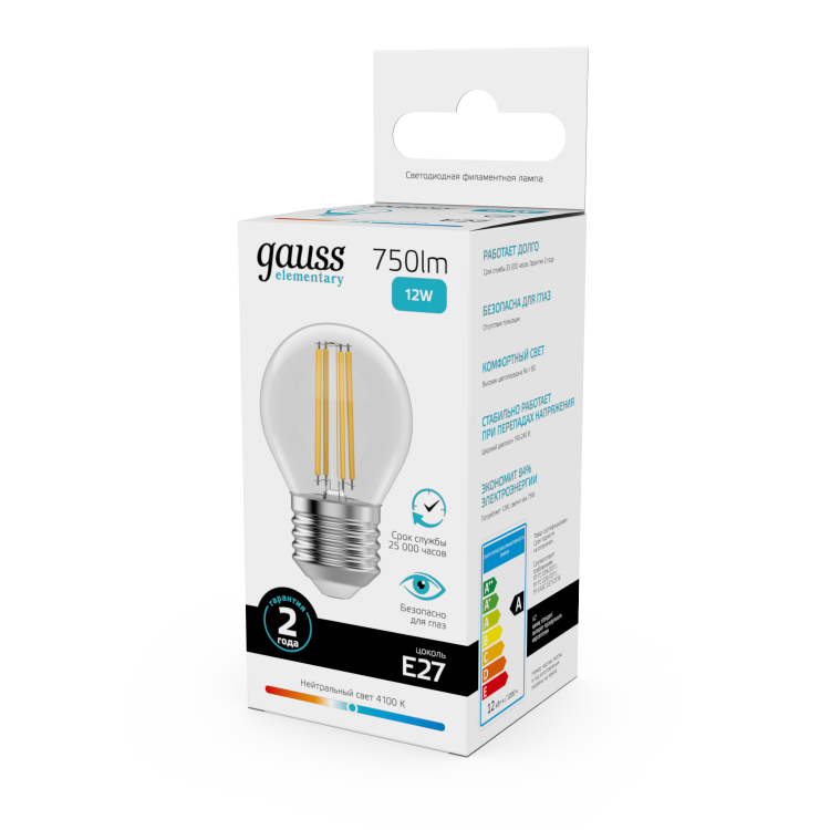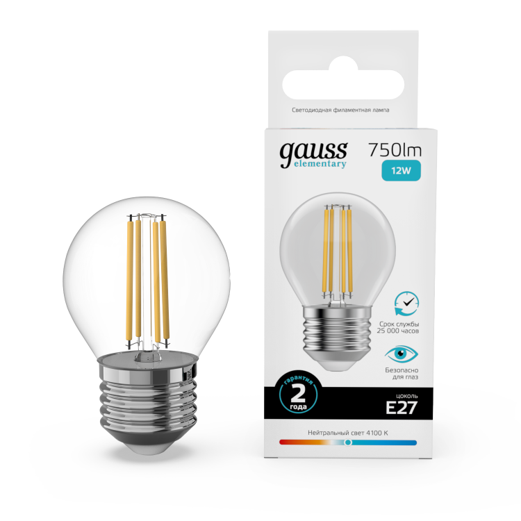 Лампа шар свд E27 12Вт 4100К 750лм G45 прозрачный филамент Gauss