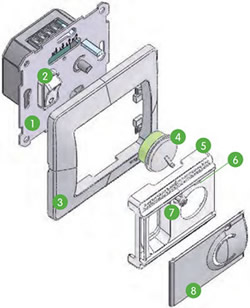 1 - плата управления. 2 - выключатель. 3 - рамка. 4 - ручка регулировки температур. 5 - накладка. 6 - индикатор. 7 - винт крепления. 8 - крышка. |