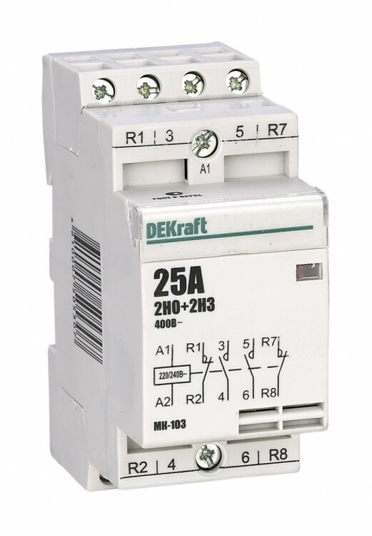 Модульный контактор серии МК-103 Dekraft; ном.ток 25 А (АС-7а); кол-во и исполнение контактов – 2НО+2НЗ; напряжение управления 220 В пер.тока; ширина – 2 мод. х 18 мм; установка – на DIN-рейку. Контакторы МК-103 применяются в сетях напряжением до 400 В пер.тока для дистанционного управления небольшими нагрузками, требующими большого количества включений / отключений, например, насосы, системы вентил яции и т.п. Модульные контакторы не требуют дополнительных настроек и специального обслуживания.