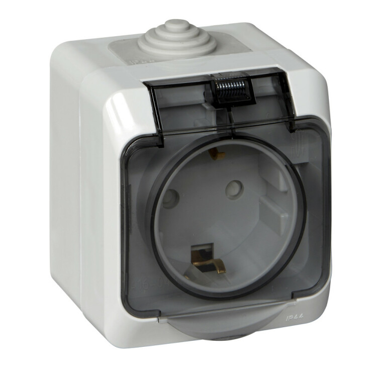Розетка одноместная Systeme Electric PA16-044C "Этюд" (16 А, IP44) открытой установки, с заземлением и защитными шторками, с крышкой, серый