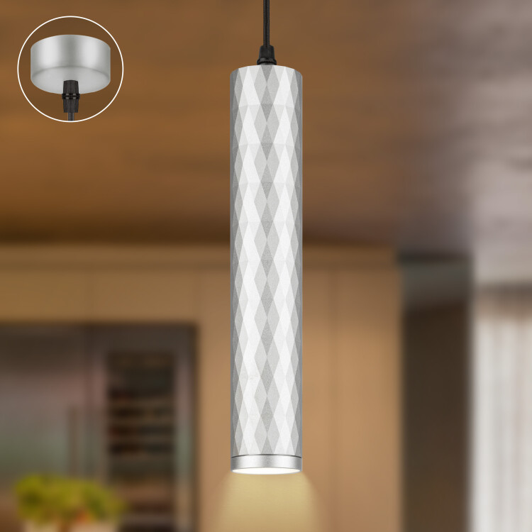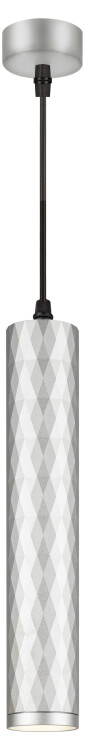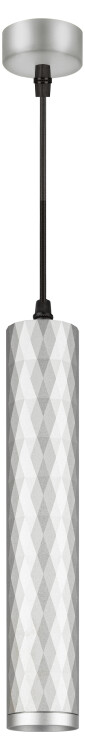 Подвесной светильник PL15 SL выполнен в фактурном рисунке "ромб". Притягивает и завораживает, создает новые грани красоты и изысканности. Корпус выполнен из металла, рисунок нанесен станком ЧПУ и покрыт устойчивой порошковой краской, которая после нанесения запекается в печи при температуре 210°С. Светильник предназначен под лампу MR-16 с цоколем GU10, напряжение питания ~230В 50/60Гц, материал металл, цвет светильника серебро, размер D55хH300мм, длина провода 1200 мм, максимальная мощность лампы 12Вт, степень защиты IP20