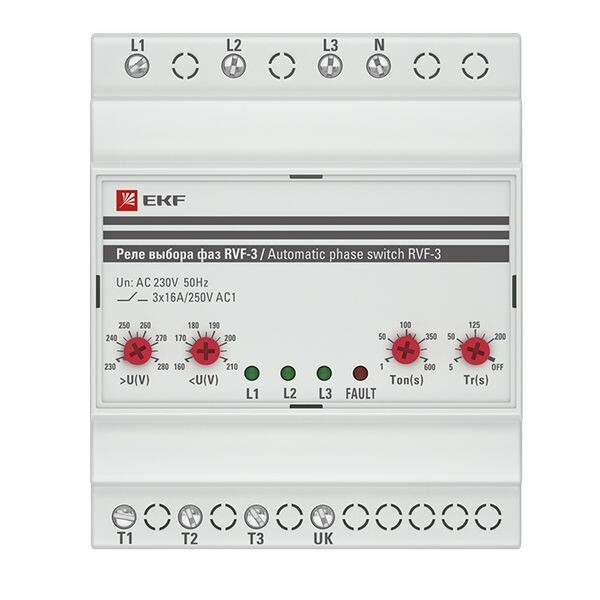 Реле выбора фаз RVF-3 EKF PROxima используется для питания однофазной нагрузки 230В/50(60) Гц от трехфазной четырехпроводной (пятипроводной) сети. Реле переключает питание однофазного потребителя в зависимости от наличия и качества фазного напряжения на проводниках L1, L2 и L3. Наиболее приоритетным является питание нагрузки от фазного проводника L1 менее приоритетным от L3, при нормальных параметрах напряжения на всех фазах, реле подключит нагрузку от приоритетной фазы (L1). Если на приоритетной фазе значение напряжения выходит за пределы порогов срабатывания, то прибор переключает нагрузку на другую фазу. Если напряжение на резервных фазах не соответствует выставленным порогам срабатывания, то нагрузка отключается