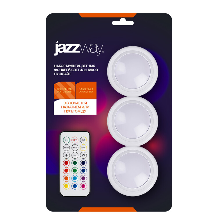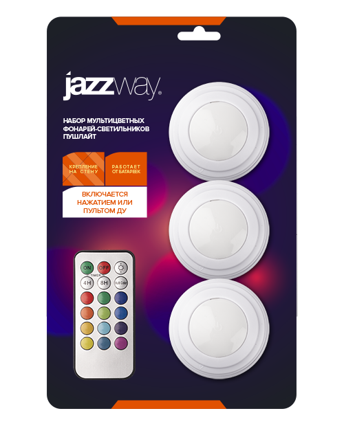 Фонарь пушлайт 3СВД+3RGB 180лм 9*ААА Jazzway (3шт)+ПУ мультиколор
