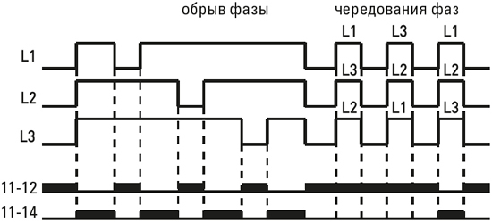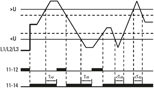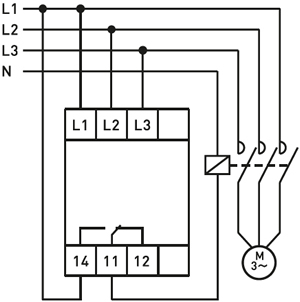 - Если питание в пределах нормы, то контакт исполнительного реле (11 - 14) замкнут, и на катушку контактора или другого исполнительного устройства подается напряжение, управляющее его включением.
