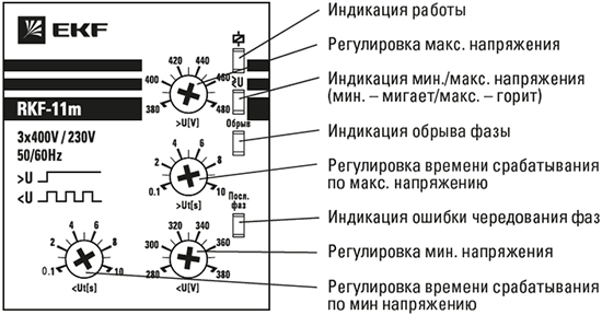 Реле имеет информативную светодиодную индикацию и регулировочные винты установки необходимых параметров, расположенные на лицевой панели.