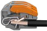 - Зажим проводов в клемме осуществляется при помощи оранжевых рычагов.