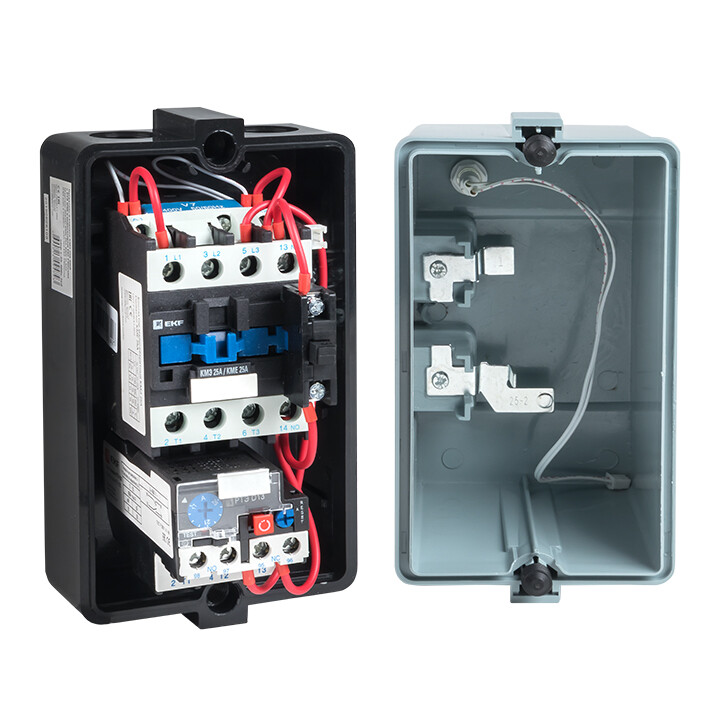 Пускатель магнитный КМЭ EKF PROxima является комплектным устройством, состоящим из малогабаритного контактора КМЭ, теплового реле РТЭ, оболочки с сальниками и кнопок управления. Пускатели предназначены для дистанционного пуска непосредственным подключением к сети и остановки трехфазных асинхронных электродвигателей с короткозамкнутым ротором на напряжение переменного тока до 400 В, а также для защиты электродвигателей от перегрузок недопустимой продолжительности и сверхтоков, возникающих при обрыве одной из фаз. При применении контакторов КМЭ 0910 – КМЭ 3210 используется пластиковый корпус, контакторов КМЭ 4011 – КМЭ 9511 – металлическая оболочка.
